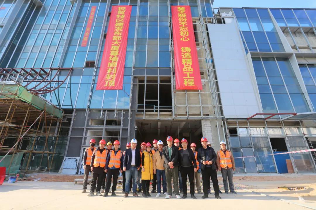 2021年1月16日,美芝股份承接的特區建發·東部大廈幕墻正式封頂,項目現場舉行了簡單而熱烈的封頂儀式。此次幕墻的順利封頂,標志著深圳市深汕特別合作區(以下簡:深汕特別合作區)第一座集總部辦公和商業商務配套為一體的超高層綜合體建筑外立面形象工程完美收官,刷新了深汕特別合作區幕墻天際線,為合作區建設增光添彩。